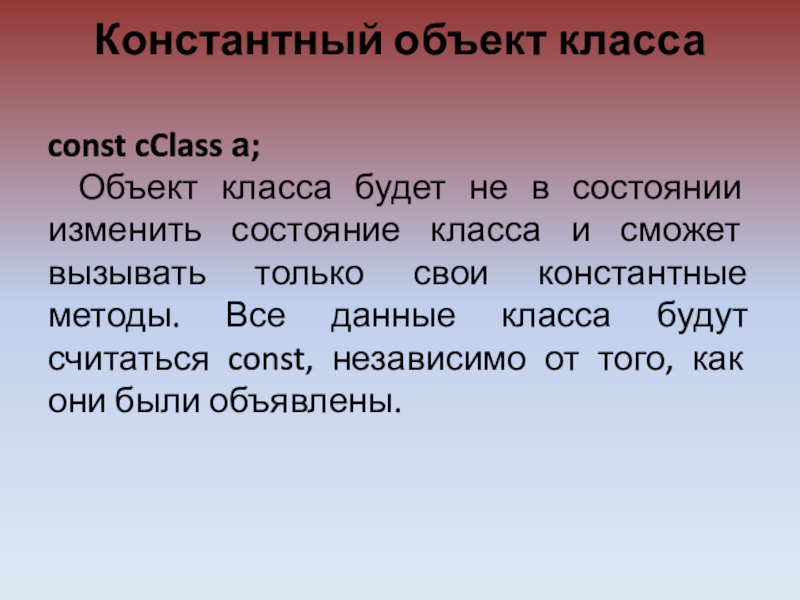 Константный объект класса const cClass а;Объект класса будет не в состоянии изменить состояние класса и сможет вызывать