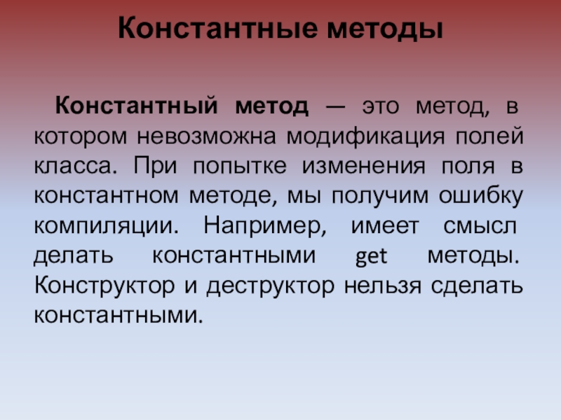 Константные методы Константный метод — это метод, в котором невозможна модификация полей класса. При попытке изменения поля