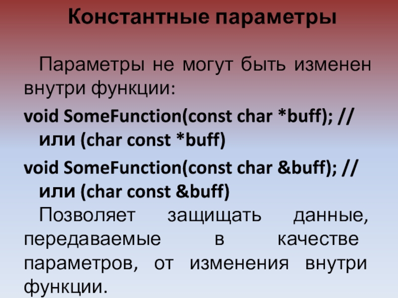 Константные параметры Параметры не могут быть изменен внутри функции:void SomeFunction(const char *buff); // или (char const *buff)
