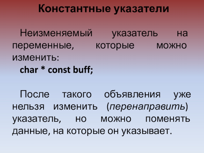 Константные указатели Неизменяемый указатель на переменные, которые можно изменить:char * const buff;После такого объявления уже нельзя изменить