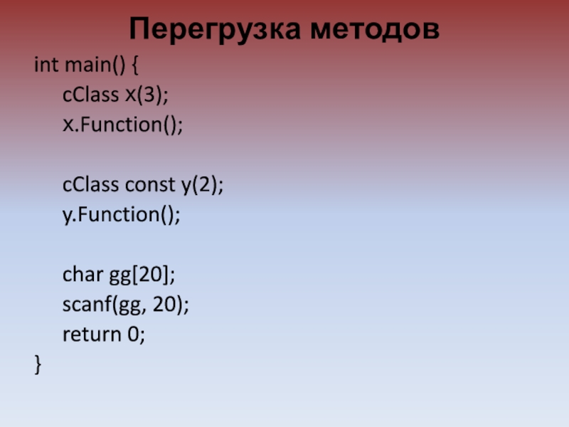 Перегрузка методов int main() { 	cClass х(3); 	х.Function();   	cClass const y(2); 	y.Function();   	char gg[20]; 	scanf(gg,