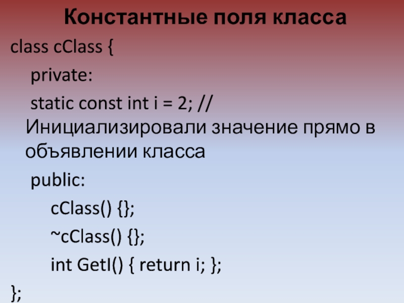 Константные поля класса class cClass { 	private: 	static const int i = 2; // Инициализировали значение прямо