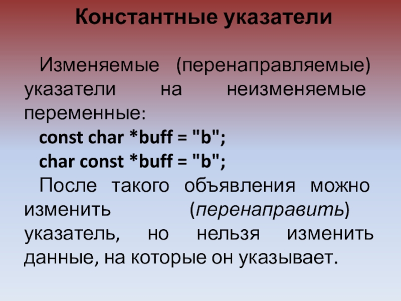 Константные указатели Изменяемые (перенаправляемые) указатели на неизменяемые переменные:const char *buff = "b"; char const *buff = "b";После такого объявления можно изменить (перенаправить) указатель, но нельзя изменить данные, на которые он указывает.