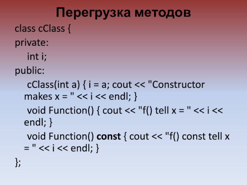 Перегрузка методов class cClass { private: 	int i;   public:   	cClass(int a) { i = a;