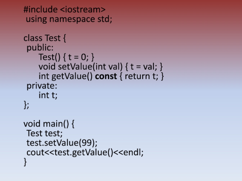 #include using namespace std;class Test { 	public: 		Test() { t = 0; } 		void setValue(int val) {