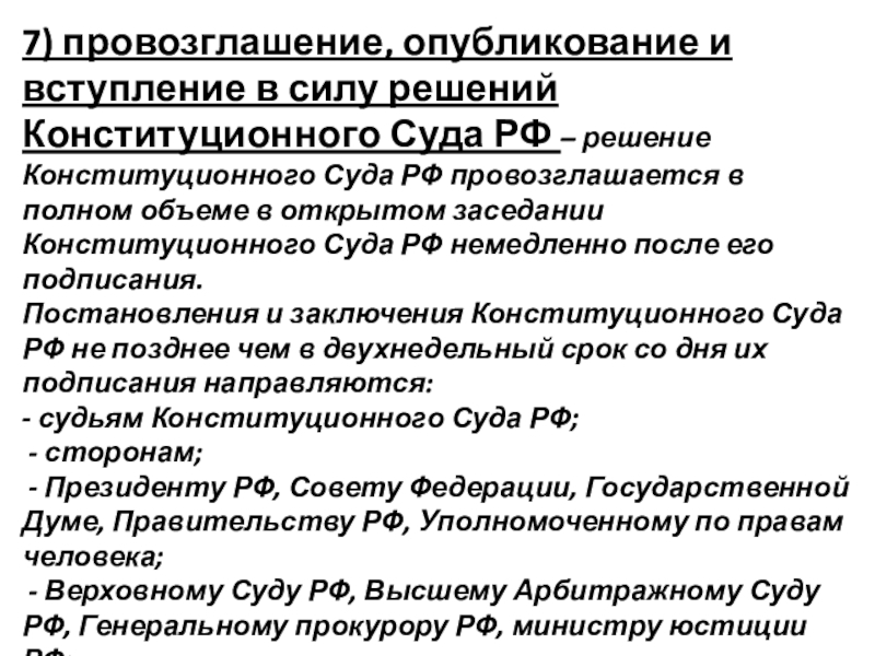 Слайд 177) провозглашение, опубликование и вступление в силу решений Конституционного Суда