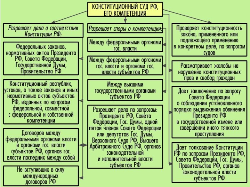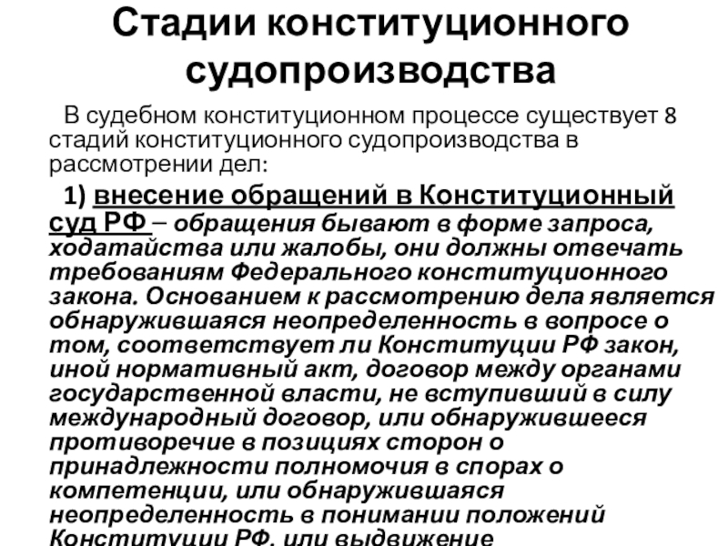 – обращения бывают в форме запроса, ходатайства или жалобы, они должны отвечать требованиям Федерального конституционного закона. Основанием к рассмотрению дела является обнаружившаяся неопределенность в вопросе о том, соответствует ли Конституции РФ закон, иной нормативный акт, договор между органами государственной власти, не вступивший в силу международный договор, или обнаружившееся противоречие в позициях сторон о принадлежности полномочия в спорах о компетенции, или обнаружившаяся неопределенность в понимании положений Конституции РФ, или выдвижение Государственной Думой обвинения Президента РФ в государственной измене или совершении иного тяжкого преступления.
