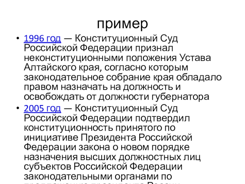 2005 год — Конституционный Суд Российской Федерации подтвердил конституционность принятого по инициативе Президента Российской Федерации закона о новом порядке назначения высших должностных лиц субъектов Российской Федерации законодательными органами по предложению президента России