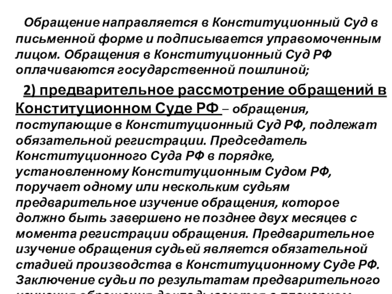 предварительное рассмотрение обращений в Конституционном Суде РФ – обращения, поступающие в Конституционный Суд РФ, подлежат обязательной регистрации. Председатель Конституционного Суда РФ в порядке, установленному Конституционным Судом РФ, поручает одному или нескольким судьям предварительное изучение обращения, которое должно быть завершено не позднее двух месяцев с момента регистрации обращения. Предварительное изучение обращения судьей является обязательной стадией производства в Конституционному Суде РФ. Заключение судьи по результатам предварительного изучения обращения докладываются в пленарном заседании;