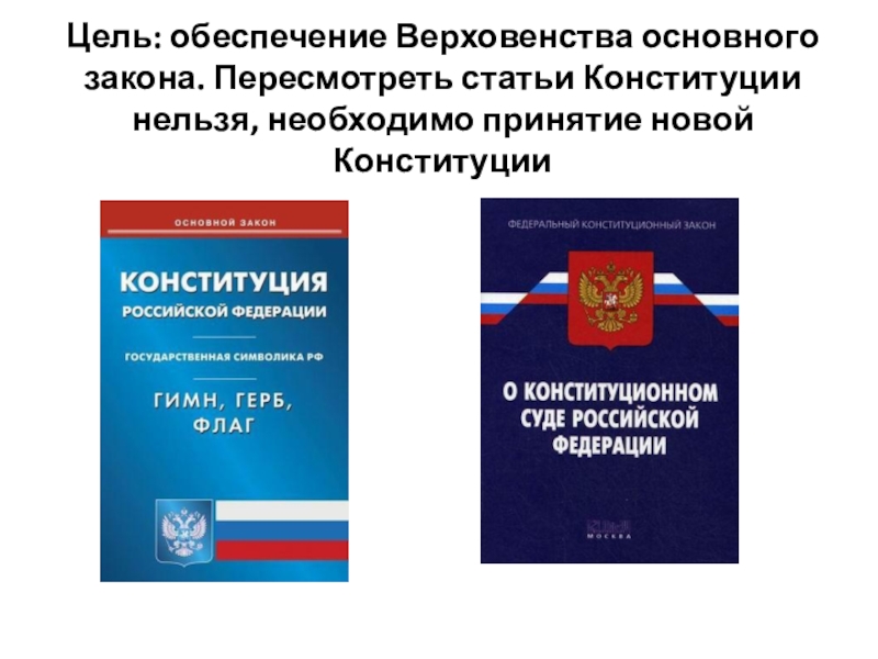 Слайд 4Цель: обеспечение Верховенства основного закона. Пересмотреть статьи Конституции нельзя, необходимо