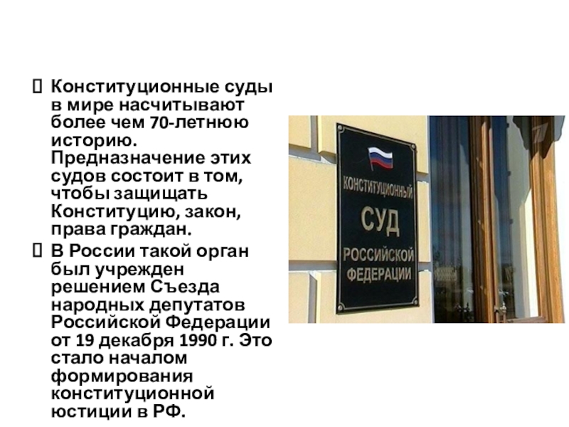Слайд 3Конституционные суды в мире насчитывают более чем 70-летнюю историю. Предназначение