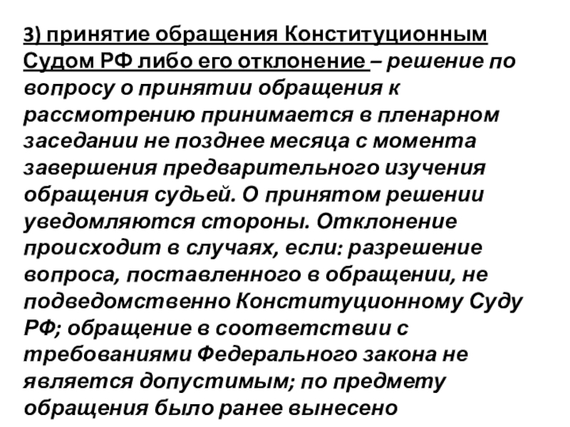 пленарном заседании не позднее месяца с момента завершения предварительного изучения обращения судьей. О принятом решении уведомляются стороны. Отклонение происходит в случаях, если: разрешение вопроса, поставленного в обращении, не подведомственно Конституционному Суду РФ; обращение в соответствии с требованиями Федерального закона не является допустимым; по предмету обращения было ранее вынесено постановление, сохраняющее свою силу;