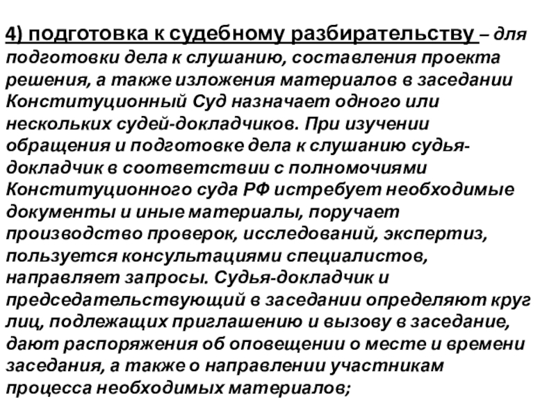 Конституционный Суд назначает одного или нескольких судей-докладчиков. При изучении обращения и подготовке дела к слушанию судья-докладчик в соответствии с полномочиями Конституционного суда РФ истребует необходимые документы и иные материалы, поручает производство проверок, исследований, экспертиз, пользуется консультациями специалистов, направляет запросы. Судья-докладчик и председательствующий в заседании определяют круг лиц, подлежащих приглашению и вызову в заседание, дают распоряжения об оповещении о месте и времени заседания, а также о направлении участникам процесса необходимых материалов;