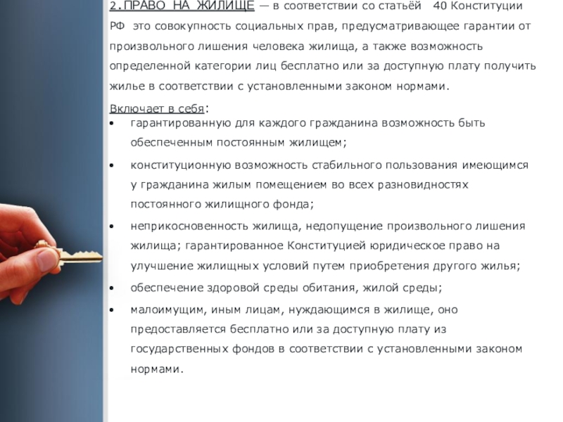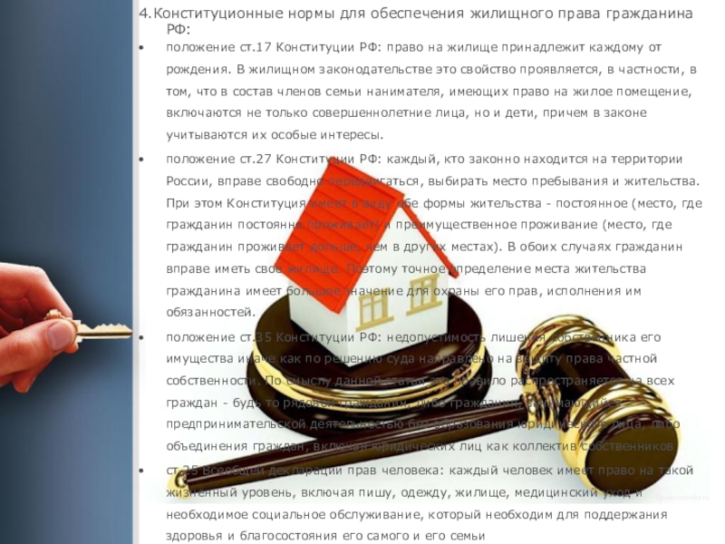 неприкосновенность жилища, недопущение произвольного лишения жилища; гарантированное Конституцией юридическое право на улучшение жилищных условий путем приобретения другого жилья;