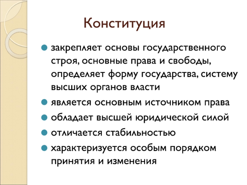 Конституциязакрепляет основы государственного строя, основные права и свободы, определяет форму государства, систему высших органов властиявляется основным источником