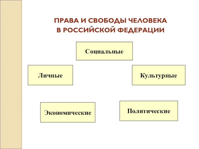 ПРАВА И СВОБОДЫ ЧЕЛОВЕКА В РОССИЙСКОЙ ФЕДЕРАЦИИЛичныеЭкономическиеКультурныеПолитическиеСоциальные