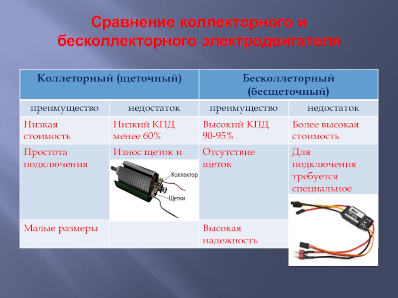 Слайд 8Сравнение коллекторного и бесколлекторного электродвигателя