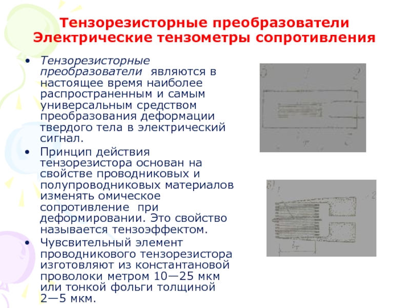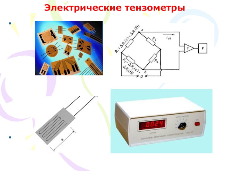 Слайд 12Тензорезисторные преобразователи Электрические тензометры сопротивления