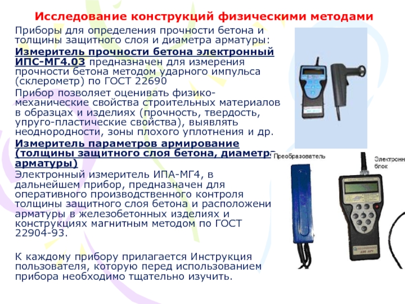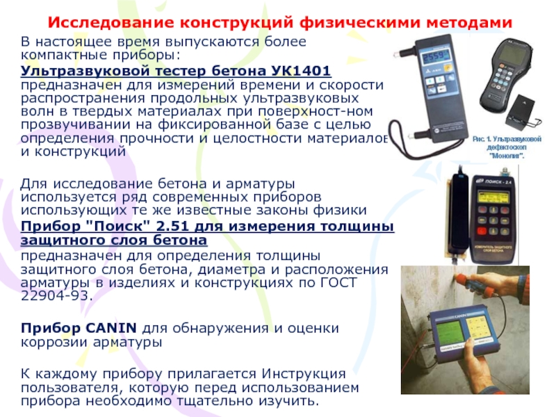 Для исследование бетона и арматуры используется ряд современных приборов использующих те же известные законы физики