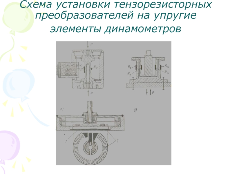 Слайд 42Схема установки тензорезисторных преобразователей на упругие элементы динамометров