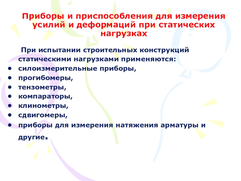Слайд 2Приборы и приспособления для измерения усилий и деформаций при статических