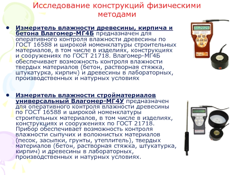 широкой номенклатуры строительных материалов, в том числе в изделиях, конструкциях и сооружениях по ГОСТ 21718. Влагомер-МГ4Б обеспечивает возможность контроля влажности твердых материалов (бетон, растворная стяжка, штукатурка, кирпич) и древесины в лабораторных, производственных и натурных условиях