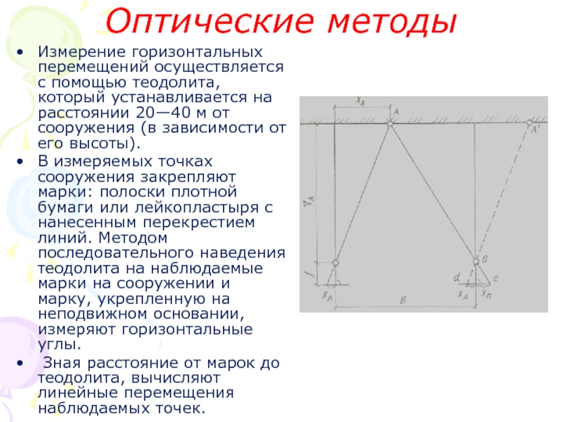 В измеряемых точках сооружения закрепляют марки: полоски плотной бумаги или лейкопластыря с нанесенным перекрестием линий. Методом последовательного наведения теодолита на наблюдаемые марки на сооружении и марку, укрепленную на неподвижном основании, измеряют горизонтальные углы.