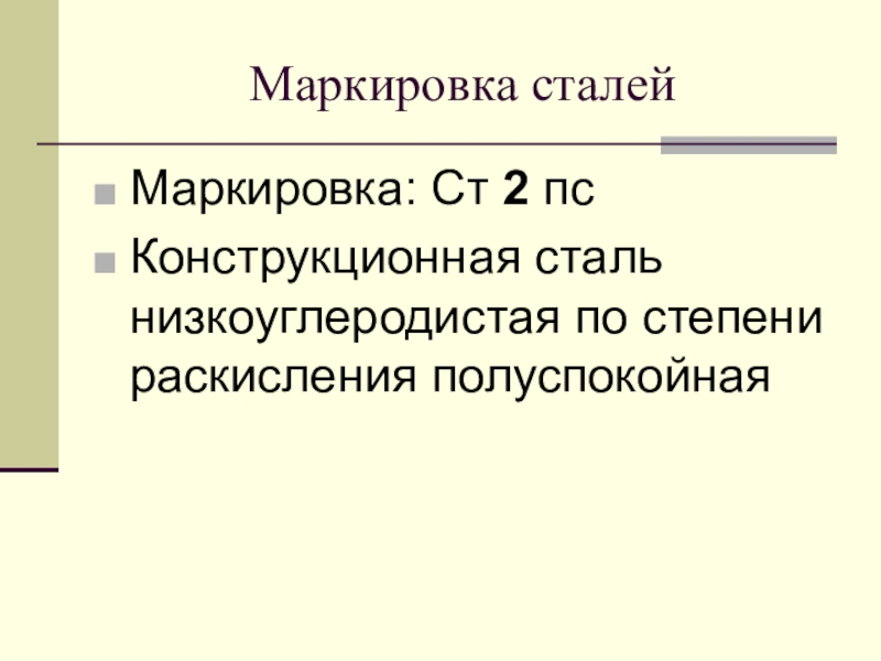 Маркировка сталейМаркировка: Ст 2 псКонструкционная сталь низкоуглеродистая по степени раскисления полуспокойная