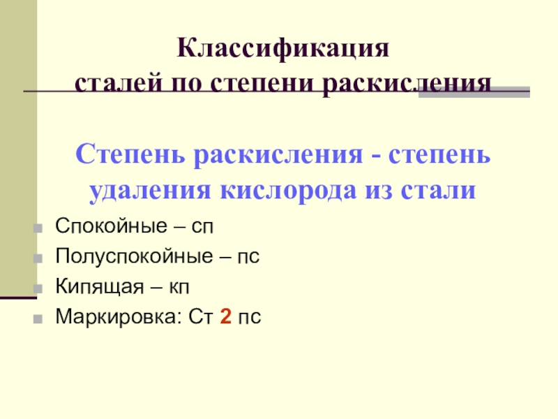 Классификация  сталей по степени раскисления  Степень раскисления - степень удаления кислорода из сталиСпокойные – спПолуспокойные