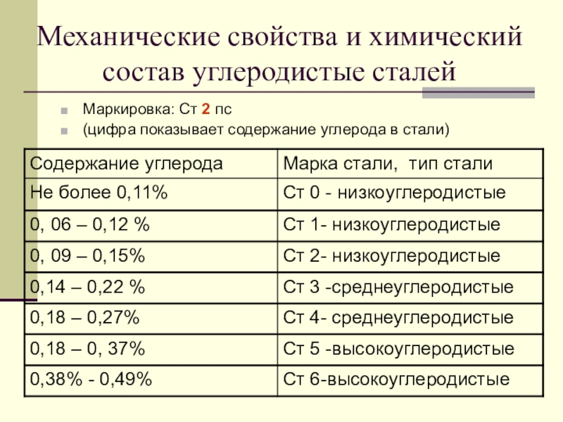 Механические свойства и химический состав углеродистые сталей Маркировка: Ст 2 пс (цифра показывает содержание углерода в стали)