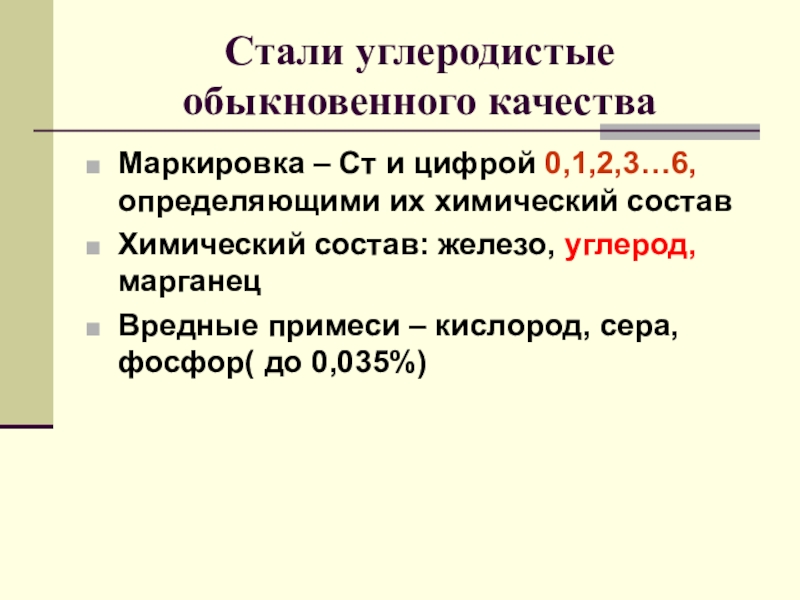 Стали углеродистые обыкновенного качестваМаркировка – Ст и цифрой 0,1,2,3…6, определяющими их химический составХимический состав: железо, углерод, марганецВредные
