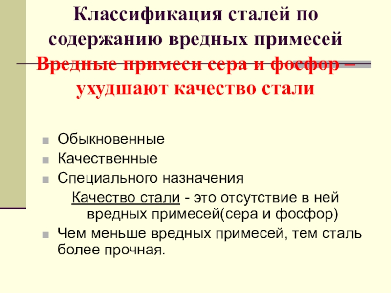 Классификация сталей по содержанию вредных примесей Вредные примеси сера и фосфор – ухудшают качество сталиОбыкновенныеКачественныеСпециального назначенияКачество стали