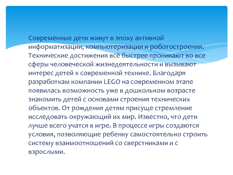 Слайд 2Современные дети живут в эпоху активной информатизации, компьютеризации и роботостроения.