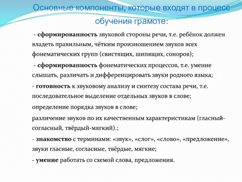 Слайд 5Основные компоненты, которые входят в процесс обучения грамоте:
