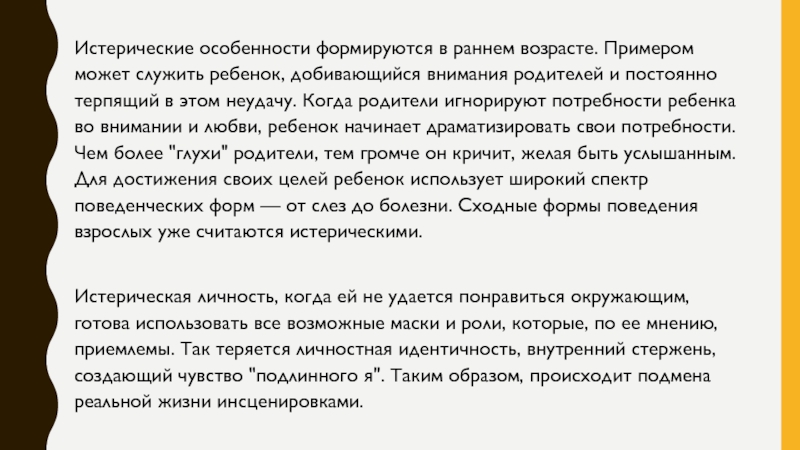 родители игнорируют потребности ребенка во внимании и любви, ребенок начинает драматизировать свои потребности. Чем более "глухи" родители, тем громче он кричит, желая быть услышанным. Для достижения своих целей ребенок использует широкий спектр поведенческих форм — от слез до болезни. Сходные формы поведения взрослых уже считаются истерическими.
