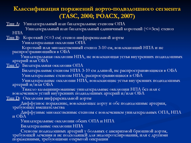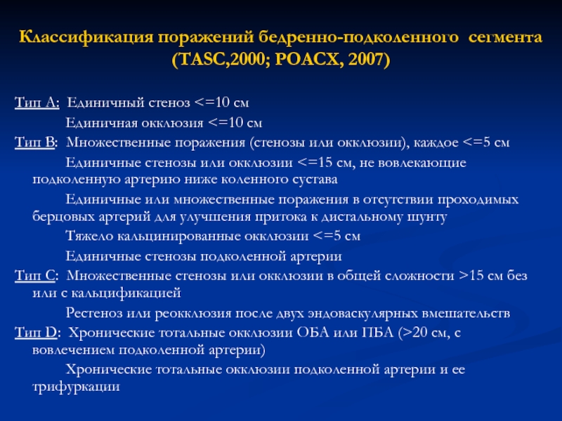 Тип D: Хронические тотальные окклюзии ОБА или ПБА (>20 см, с вовлечением подколенной артерии)
