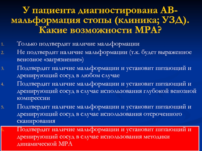 Слайд 55У пациента диагностирована АВ-мальформация стопы (клиника; УЗД). Какие возможности МРА?