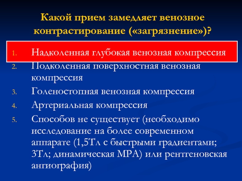 Слайд 42Какой прием замедляет венозное контрастирование («загрязнение»)?