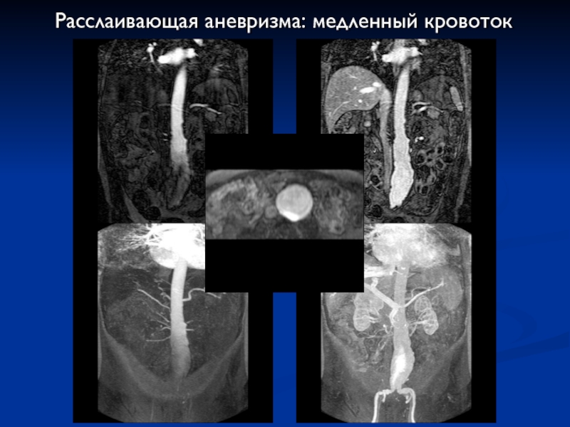 Слайд 49Расслаивающая аневризма: медленный кровоток