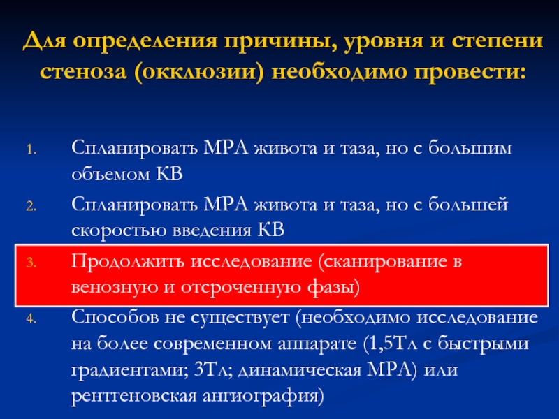 Слайд 48Для определения причины, уровня и степени стеноза (окклюзии) необходимо провести: