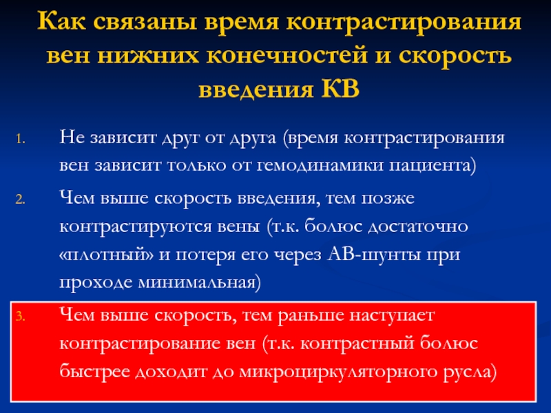 Слайд 38Как связаны время контрастирования вен нижних конечностей и скорость введения
