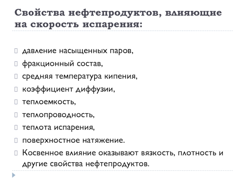 Слайд 5Свойства нефтепродуктов, влияющие на скорость испарения:
