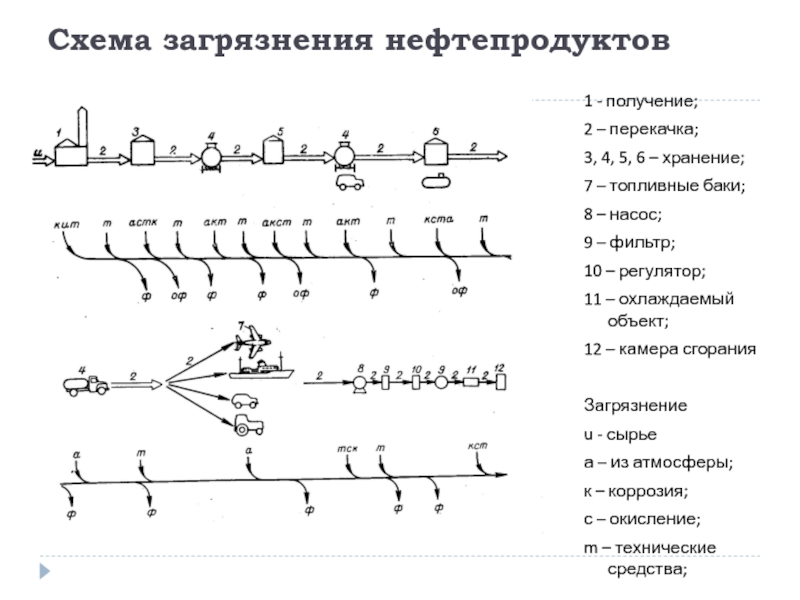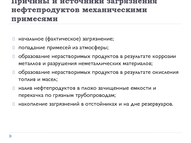 Слайд 8Причины и источники загрязнения нефтепродуктов механическими примесями