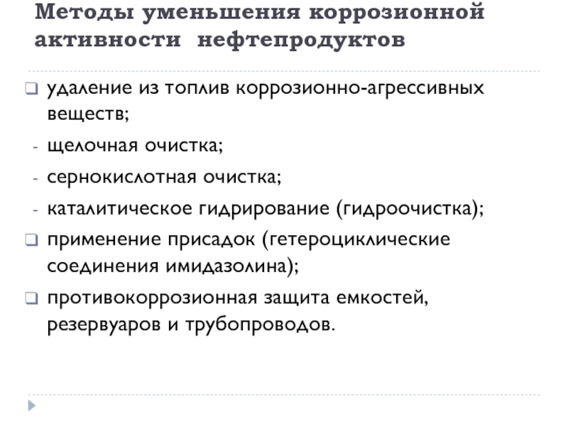 Слайд 31Методы уменьшения коррозионной активности нефтепродуктов