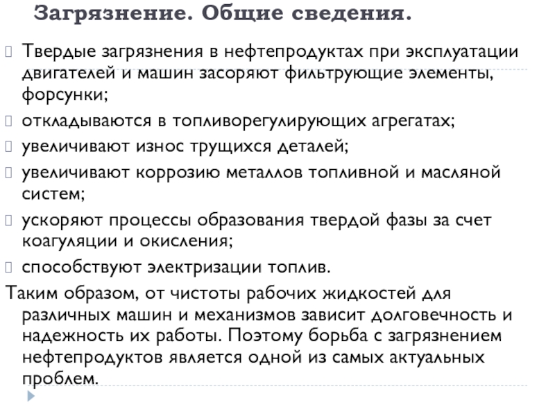 Таким образом, от чистоты рабочих жидкостей для различных машин и механизмов зависит долговечность и надежность их работы. Поэтому борьба с загрязнением нефтепродуктов является одной из самых актуальных проблем.