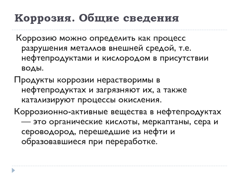 Коррозионно-активные вещества в нефтепродуктах — это органические кислоты, меркаптаны, сера и сероводород, перешедшие из нефти и образовавшиеся при переработке.