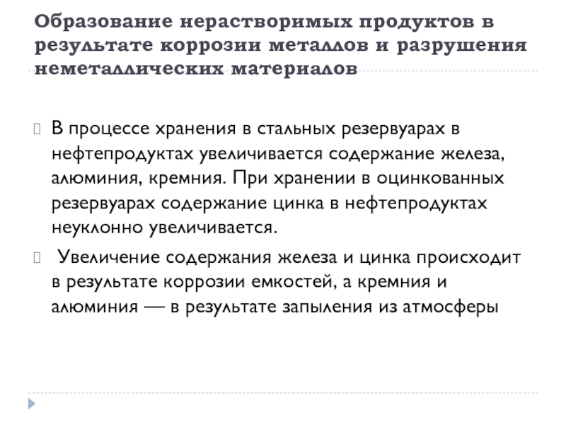 Слайд 15Образование нерастворимых продуктов в результате коррозии металлов и разрушения неметаллических