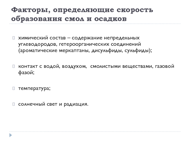 Слайд 25Факторы, определяющие скорость образования смол и осадков