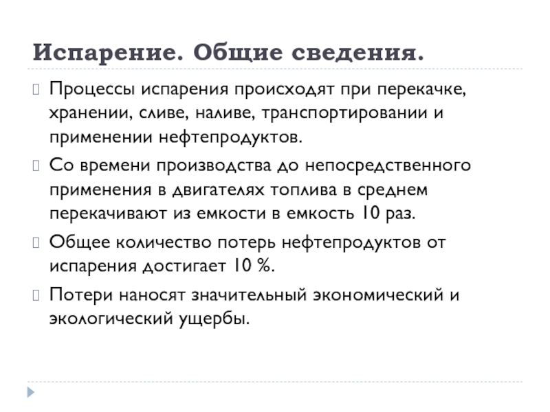 Процессы испарения происходят при перекачке, хранении, сливе, наливе,