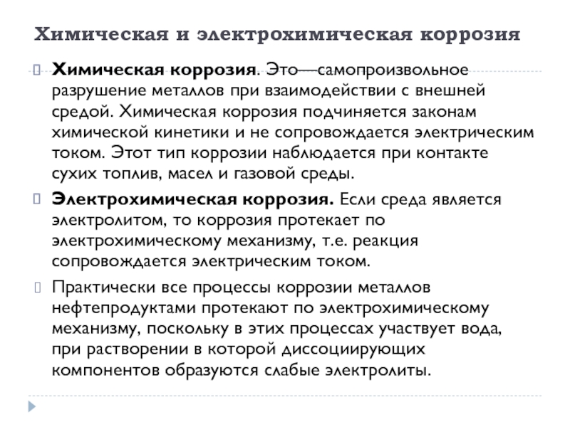 Практически все процессы коррозии металлов нефтепродуктами протекают по электрохимическому механизму, поскольку в этих процессах участвует вода, при растворении в которой диссоциирующих компонентов образуются слабые электролиты.